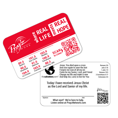 This Prayz Card has the prayer of salvation, a place for you to sign and date the start of your New Life in Christ!